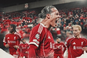 利物浦官方社媒发布了为此役制作的海报,范戴克、埃基蒂克、萨拉赫、弗林蓬、乔·戈麦斯出镜。